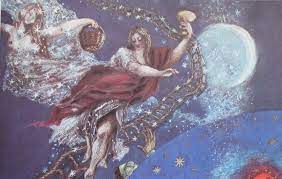 Jetzt legte er sich auf die Lauer und beobachtete das Vieh. Als um Mitternacht der Mond weiß am Himmel stand, sah er, wie sich eine Strickleiter von den Sternen heruntersenkte.