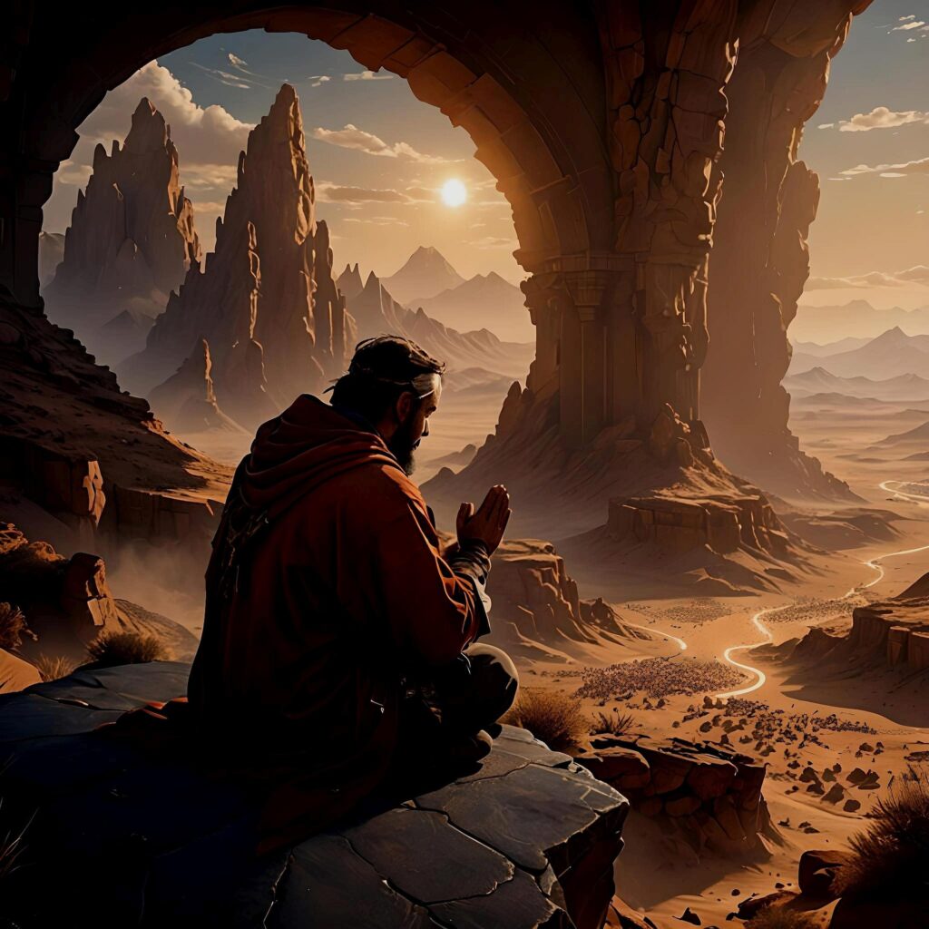 Zunächst zieht er sich in eine verlassene Festung zurück. Mauern aus Stein – und dahinter ein junger Mann mit sich selbst. In der Stille treten die Stimmen hervor, die der Alltag sonst überdeckt: Angst, Versuchung, dunkle Gedanken. Die Wüste wird zum Ort der Wahrheit. Zwanzig Jahre hält er aus. Als er die Festung wieder verlässt, gilt er als innerlich geklärt, gesammelt, freundlich. Seine Botschaft ist einfach: Das Himmelreich liegt nicht fern. Es ist im Inneren zu suchen.